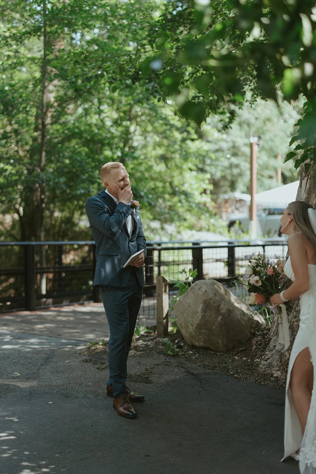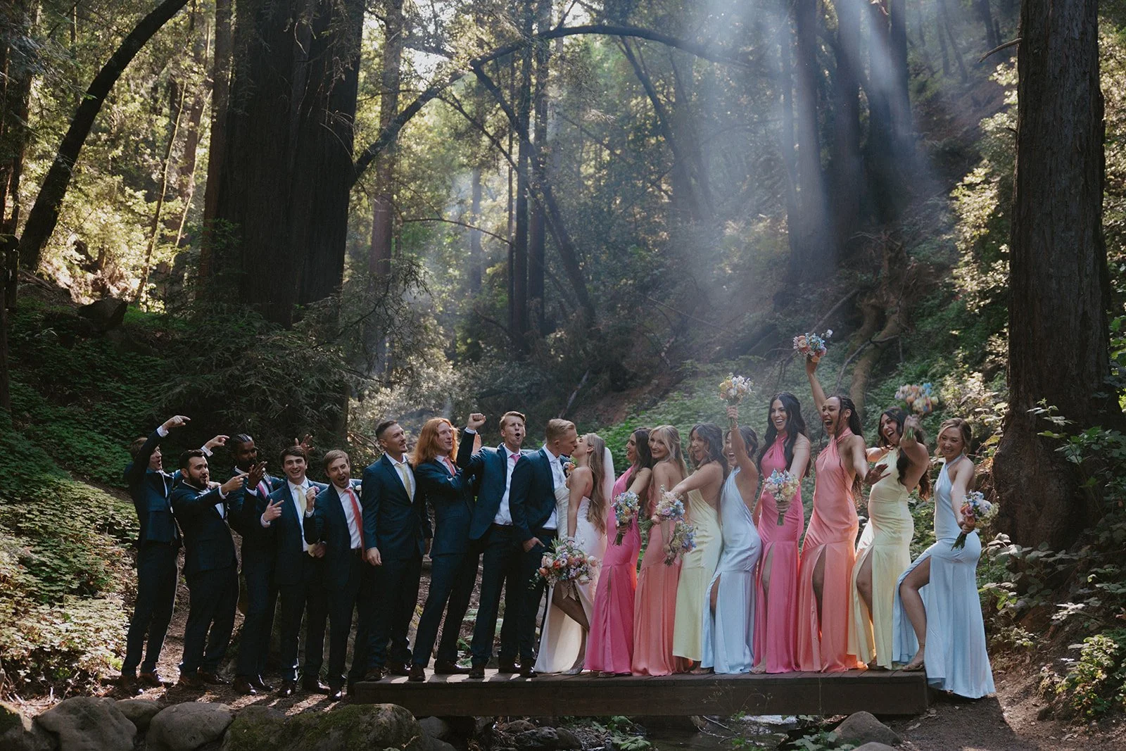Bridesmaids holding colorful floral bouquets surrounding bride – joyful pre-ceremony moment